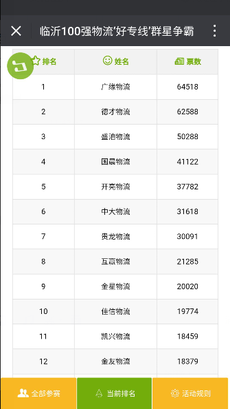2017年12月4日,在为我园区华中物流投票时发现,我物流公司也在“群星争霸”的赛事中,票数为一千多票,排在第12名,当时非常激动,董事长马守田亲自组织,副总主持,召开广缘物流专线经理和各部门会议,专题研究利用此次赛事,把广缘物流积累的二十余年的能量发挥出来,把客户群体对广缘的信赖感调动起来,同时召开各分公司视频会议,让收货人对广缘物流做更加全面的评价。